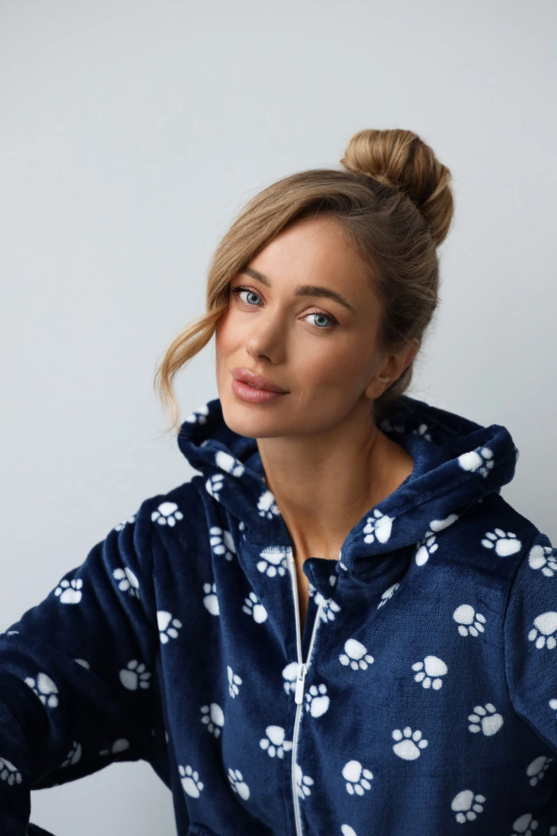 Вид тканини Махра велсофт Склад тканини 100% поліестер Догляд за одягом дбайливе прання, віджимання на низьких обертах Жіночий комбінезон із велсофту синього кольору з принт...