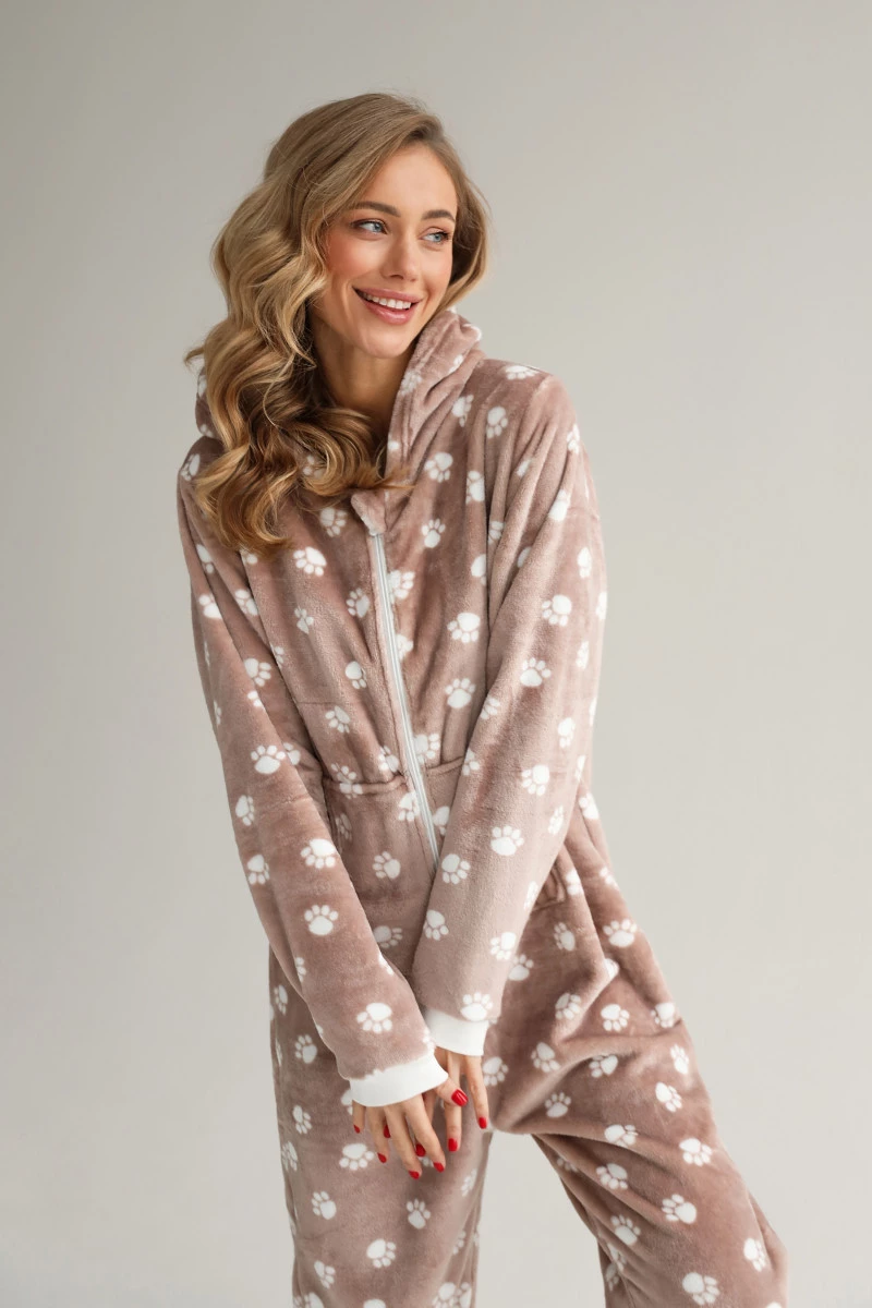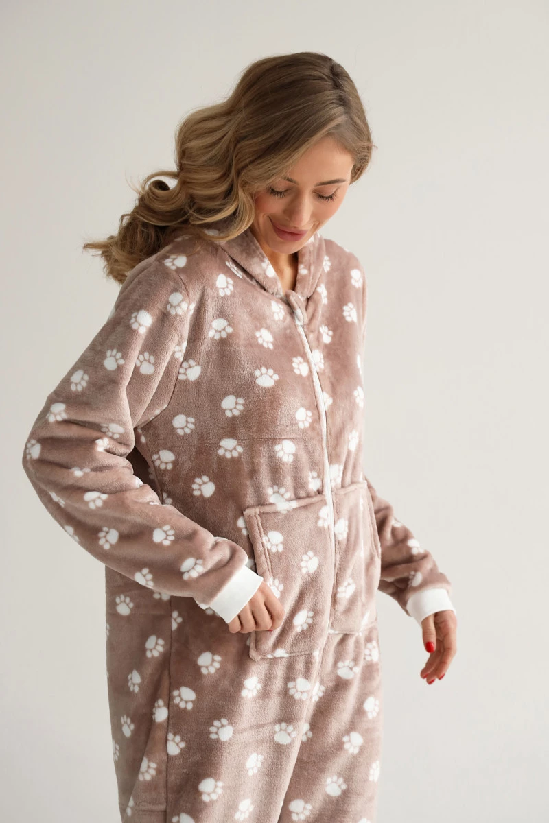 Комбінезон жіночій велсофт колір бежевий, принт лапка