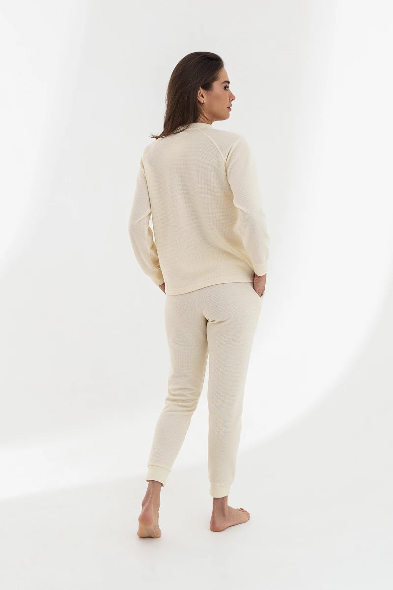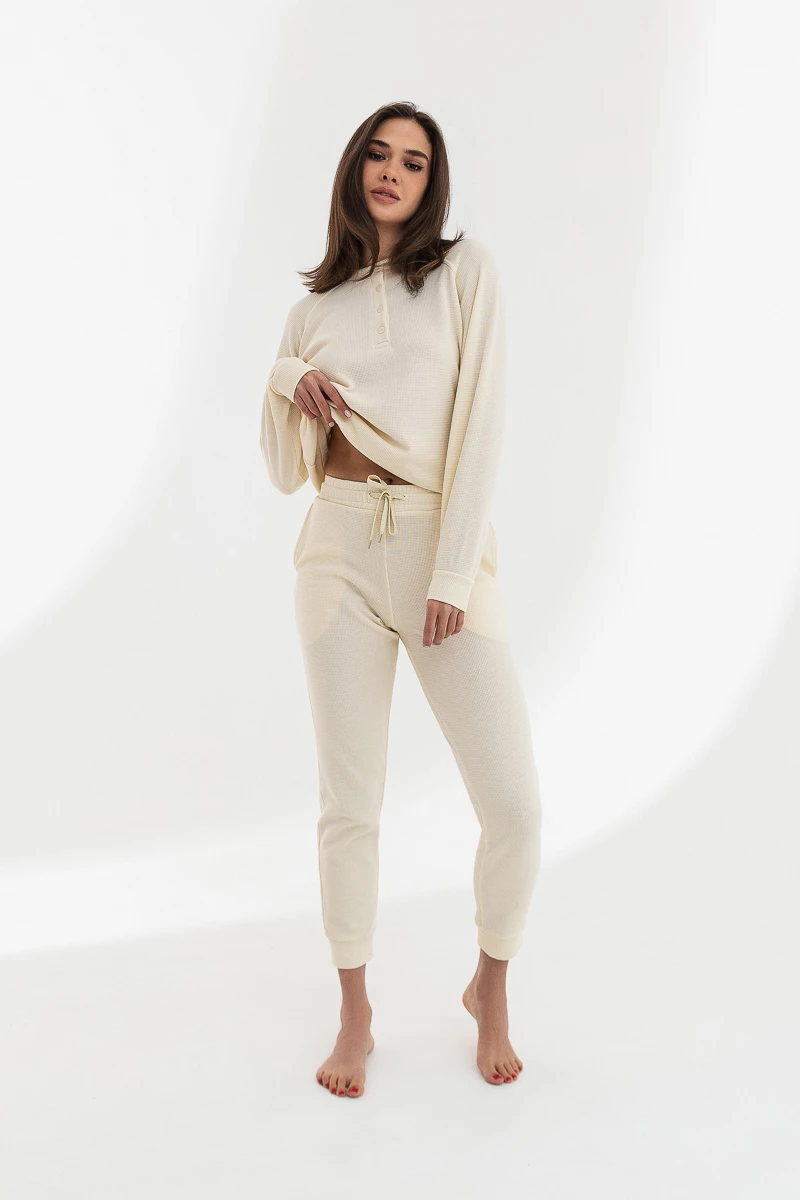 Дизайн костюма продуманий до найменших деталей, щоб ви відчували себе впевнено і стильно навіть вдома. Реглан з м'якими манжетами ідеально сидить на фігурі, підкреслюючи її лінії, а штани зі зручним поясом забезпечують ідеальну посадку без дискомфорту. Завдяки універсальному стилю, цей жіночий домашній костюм підходить не лише для сну, але й для різноманітних домашніх справ та активностей.