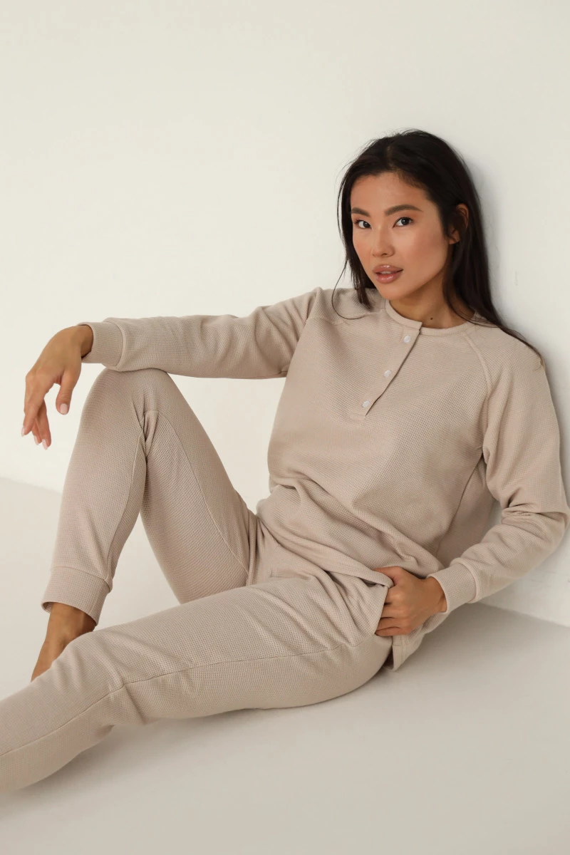 Дизайн костюма продуманий до найменших деталей, щоб ви відчували себе впевнено і стильно навіть вдома. Реглан з м'якими манжетами ідеально сидить на фігурі, підкреслюючи її лінії, а штани зі зручним поясом забезпечують ідеальну посадку без дискомфорту. Завдяки універсальному стилю, цей жіночий домашній костюм підходить не лише для сну, але й для різноманітних домашніх справ та активностей.