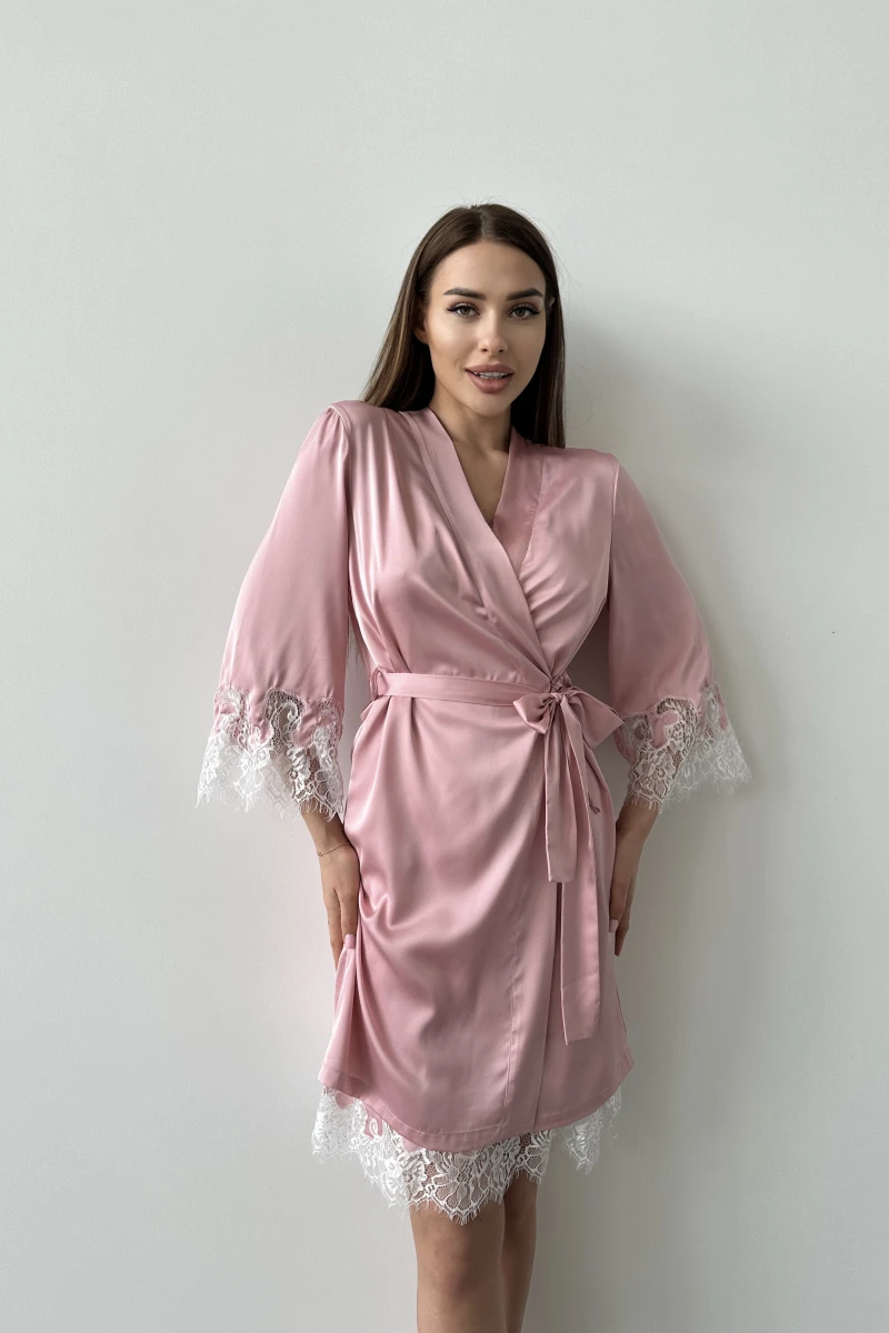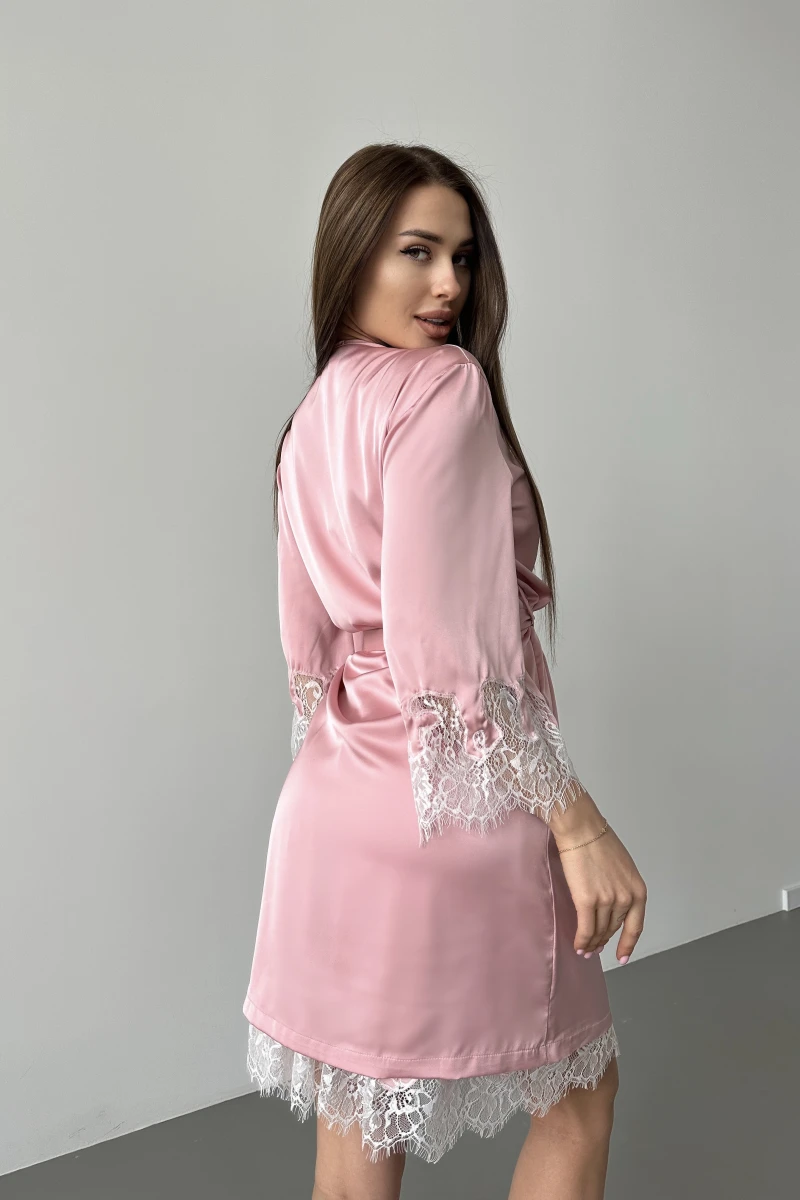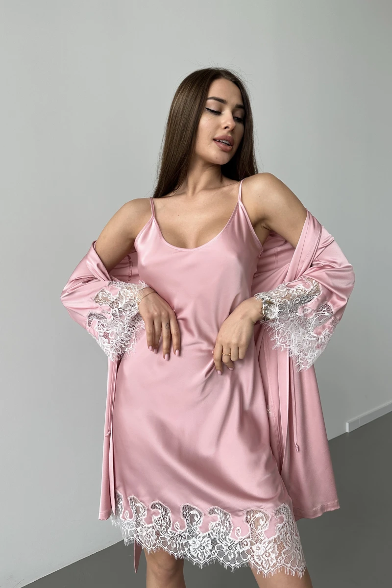 Рожевий жіночий шовковий комплект халат і сорочка з мереживом