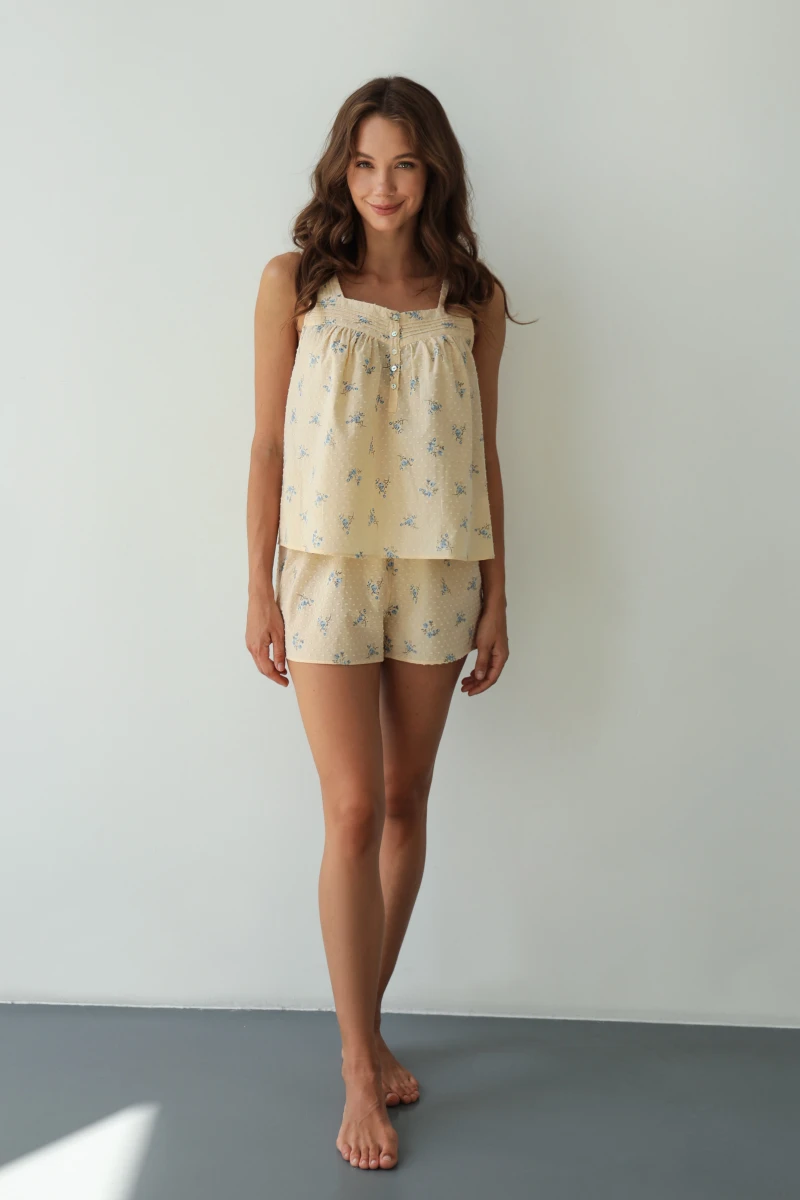 Вид тканини Батист Склад тканини 100% бавовна Колір бежевий, принт Опис Комплект для сну з майки та шорт із квітковим принтом від German Volf – це ідеальний вибір для тих, хто ...