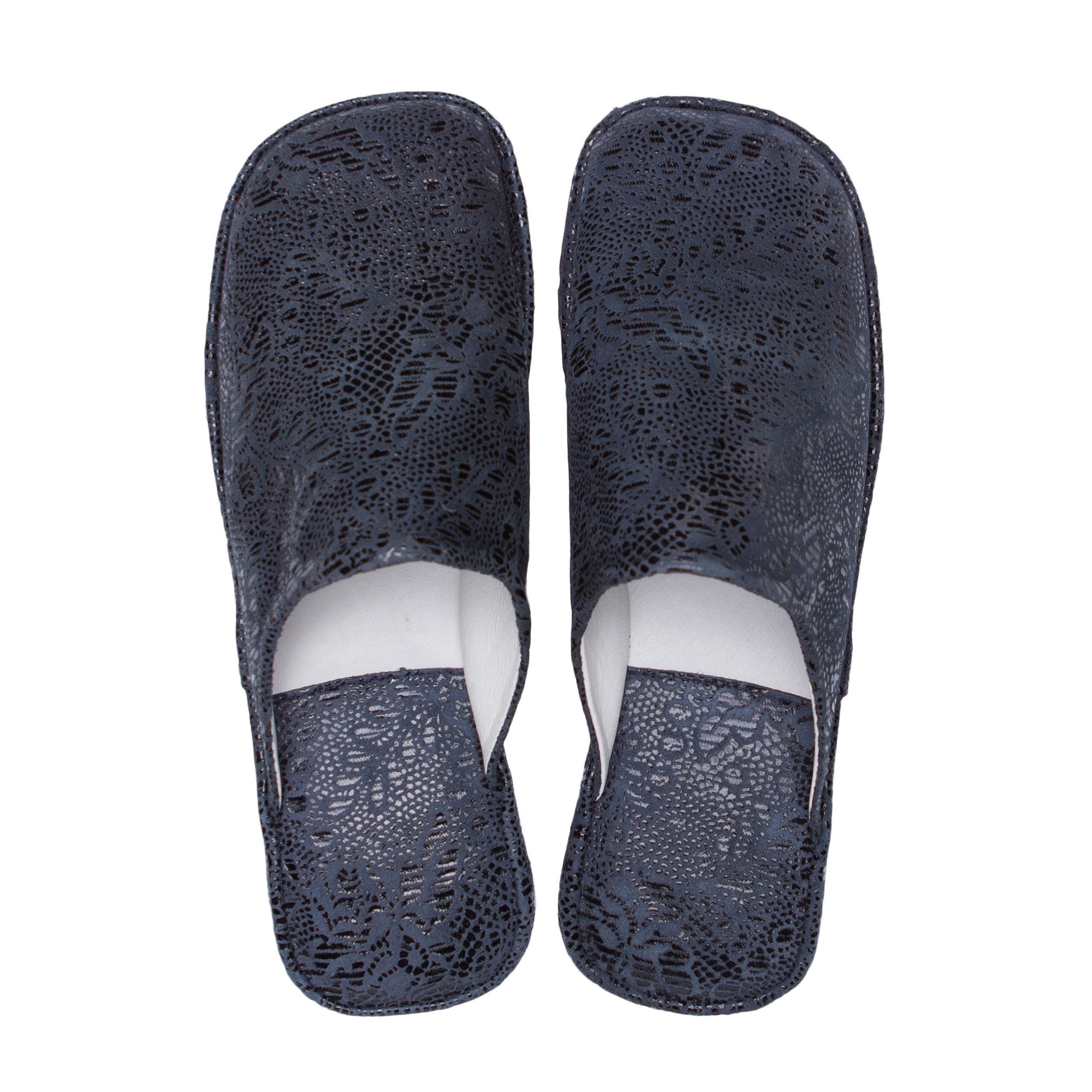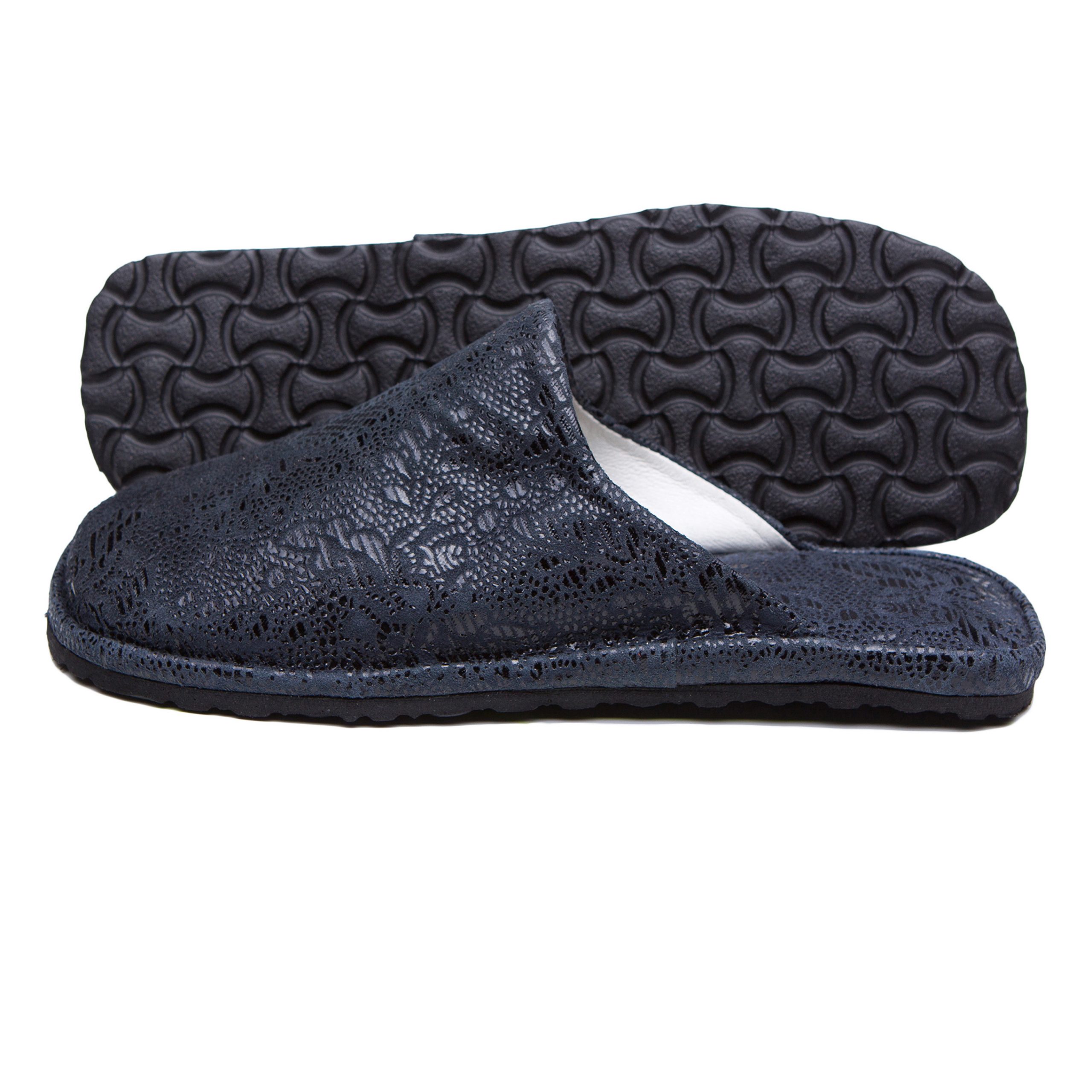 Класична модель закритих жіночих капців з фактурної шкіри насиченого синього кольору. Легка і безшумна підошва з EVA дозволить вийти в капцях навіть на відкриту терасу.