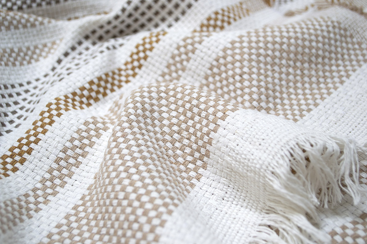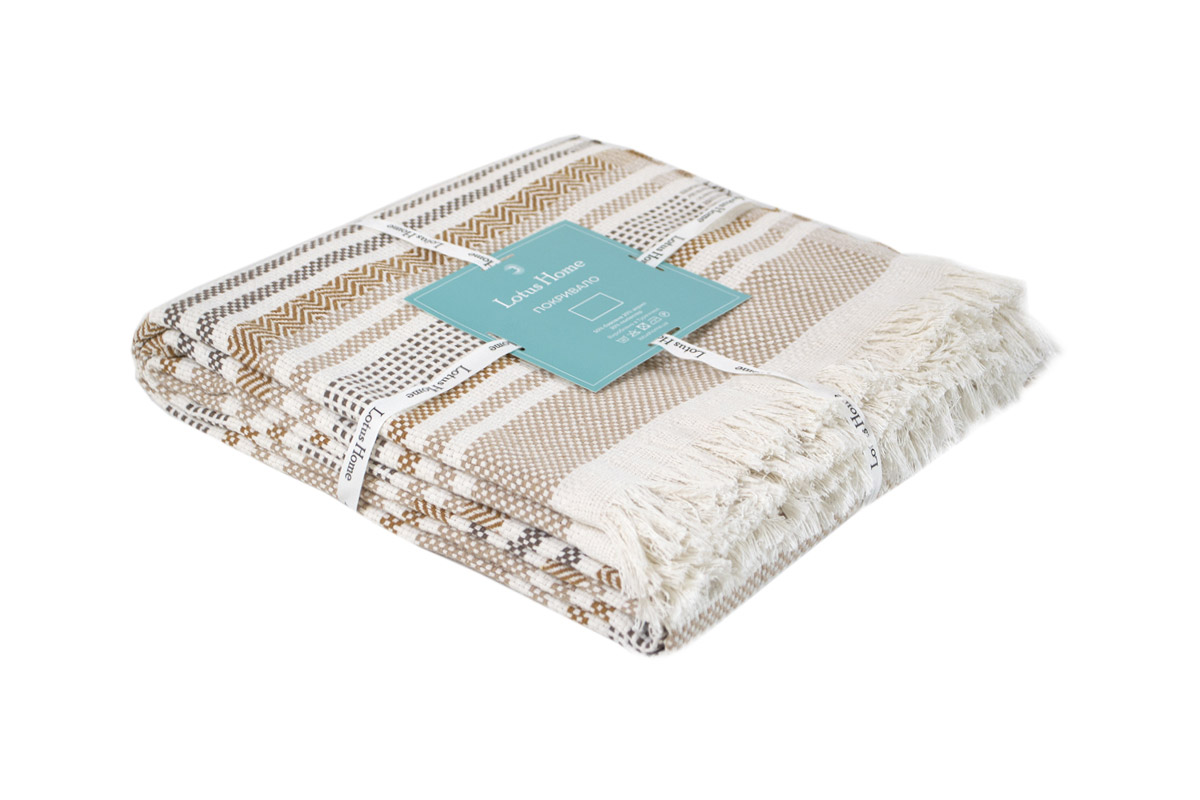 Стильне покривало бежевих відтінків зі смужками та з бахромою. Покривало виконано якісного матеріалу на основі натуральної бавовни та штучних волокон. Матеріал легкий, приємний на дотик, водночас практичний та довговічний в експлуатації.