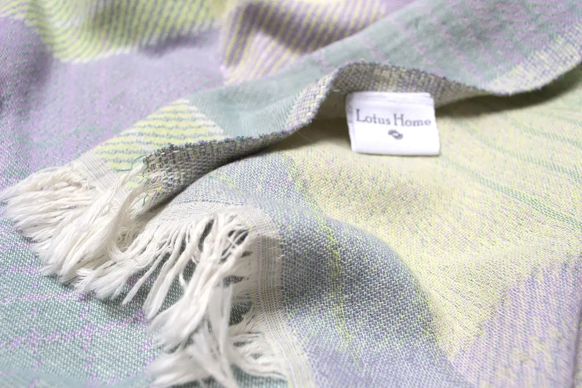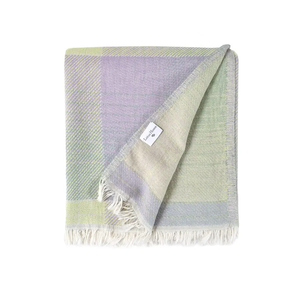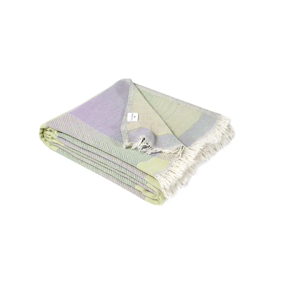 Стильне доповнення до вашого інтер'єру - легке бавовняне покривало-піке в бузково-салатових відтінках з принтом у клітинку і з бахромою. Покривало виконано з натуральної бавовняної тканини. Матеріал легкий, м'який і приємний на дотик, відмінно пропускає повітря, дарує відчуття комфорту. Покривало стане незамінним для створення затишної атмосфери в кімнаті, а також може використовуватися для укривання в теплу пору року.