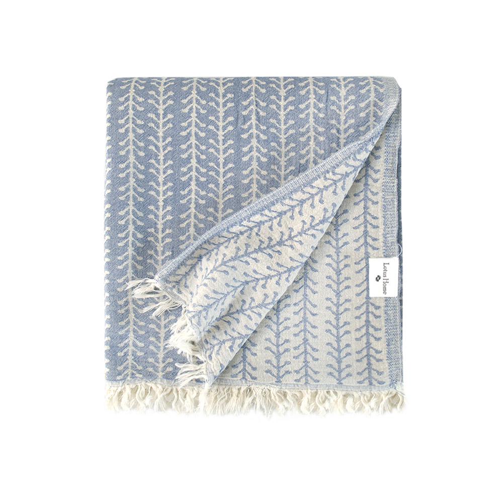 Стильне доповнення до вашого інтер'єру - покривало блакитного кольору з красивим візерунком та бахромою. Покривало виготовлене з натуральної бавовняної тканини. Матеріал легкий, м'який і приємний на дотик, добре пропускає повітря, дарує відчуття комфорту. Покривало стане незамінним для створення затишної атмосфери в кімнаті, а також може використовуватися для укриття в теплу пору року.