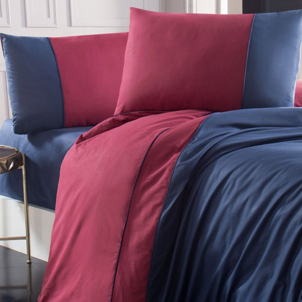 Наволочка (2 шт.): 50x70 смПостільна білизна для сучасного інтер'єру виконана у модному двоколірному дизайні. Темно-синій колір красиво поєднується з бордовим відтінком, виглядає стильно та лаконічно. Тканина класу люкс з натуральної бавовни приємна на дотик, добре пропускає повітря, дарує затишок та комфорт під час сну.