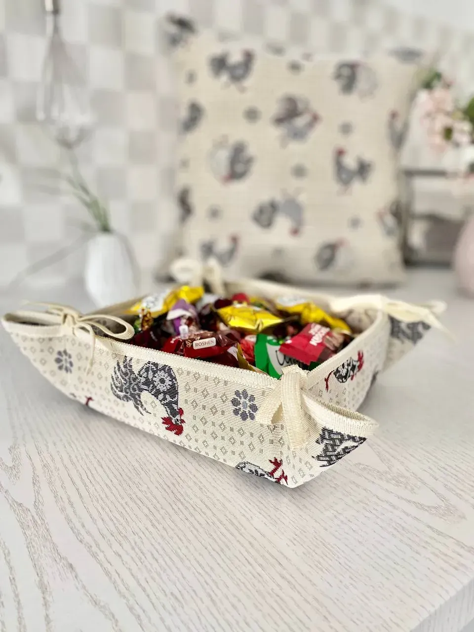 Гобеленова хлібниця – елегантний та практичний елемент сервірування, який надає вашому столу затишок та стиль. Вона ідеально підходить для подачі хліба, булочок чи печива. Завдяки щільній гобеленовій тканині хлібниця добре тримає форму, легко доглядається та довго зберігає привабливий вигляд.