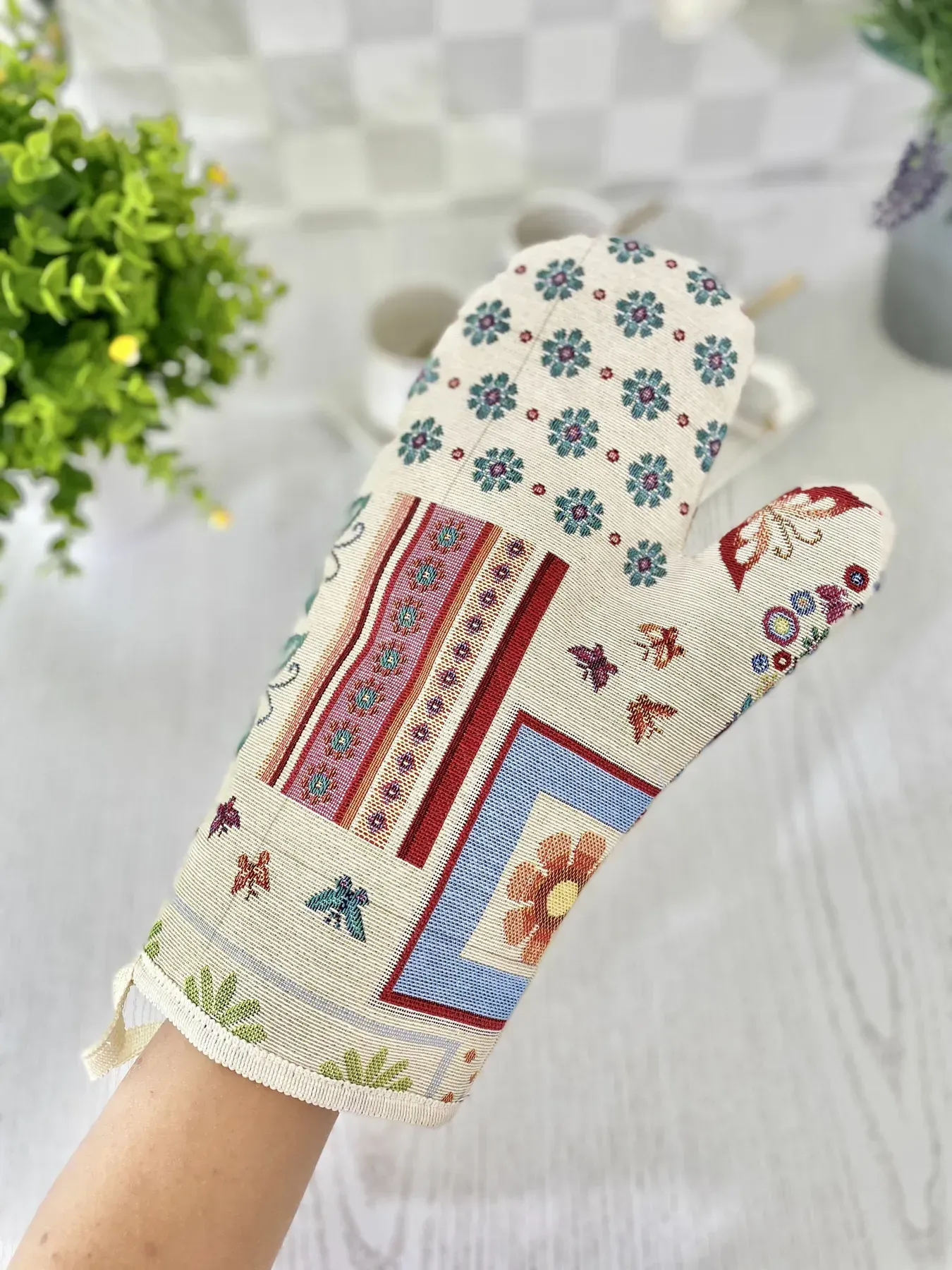 Гобеленові рукавички та прихватки – стильні та практичні помічники на вашій кухні. Вони надійно захищають руки від високих температур і одночасно надають кухонному простору затишку та вишуканості. Завдяки щільній гобеленовій тканині вироби стійкі до зношування, добре тримають форму, легко стираються і не втрачають колір з часом.