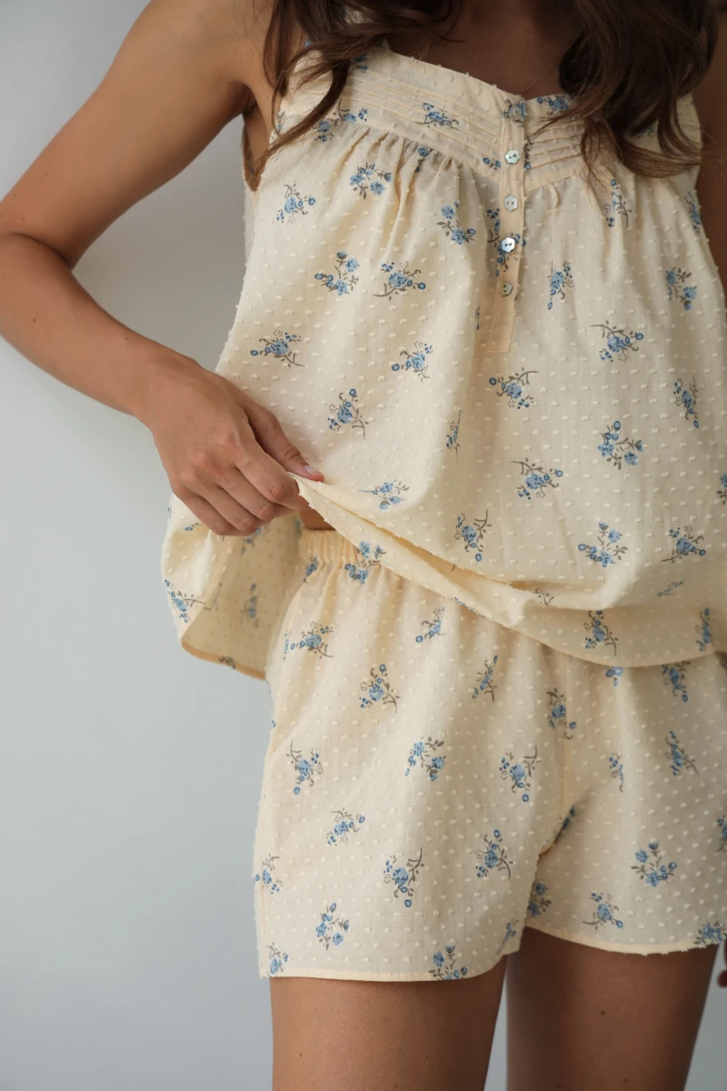 Шорти з еластичним поясом забезпечують комфортну посадку на талії, не створюючи тиску, що дозволяє зручно рухатися та насолоджуватися сном без будь-яких незручностей. Вільний крій шорт забезпечує легкість і свободу рухів, а їхня оптимальна довжина надає образу грайливості. Квітковий принт на шортах гармонійно поєднується з майкою, створюючи цілісний та стильний комплект для дому та сну.