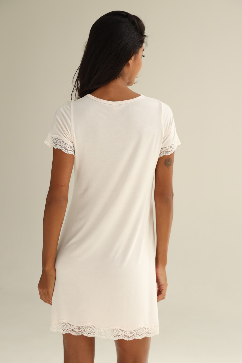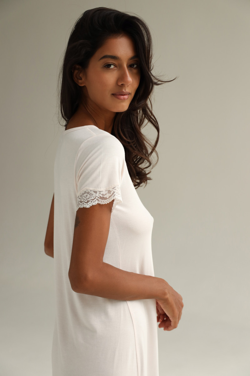 Футболка-сорочка для сну з модалу з мереживом у кремовому кольорі - це втілення витонченості та комфорту, створене для тих, хто цінує якість і стиль навіть у нічному одязі. Модал, з якого виконана сорочка, відрізняється винятковою м'якістю та гладкістю. Цей натуральний матеріал не тільки приємний на дотик, але й має відмінні дихаючі властивості, підтримуючи оптимальний мікроклімат для комфортного сну. Модал ефективно вбирає вологу та пропускає повітря, забезпечуючи відчуття свіжості протягом усієї ночі.