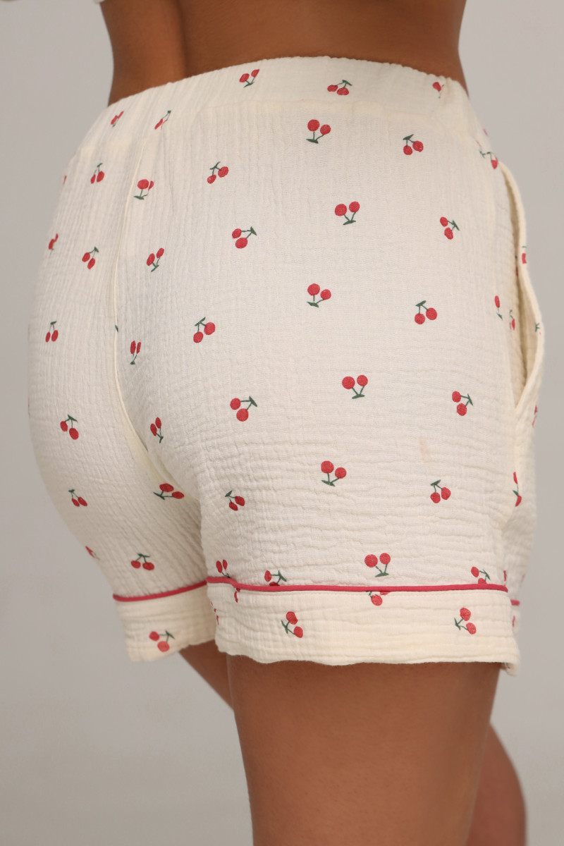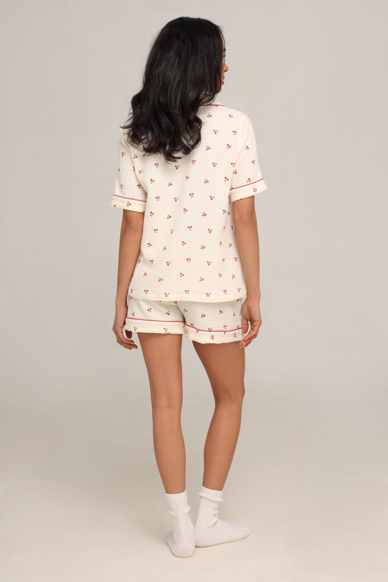 Сорочка виконана в класичному молочному кольорі і прикрашена делікатним принтом у вигляді маленьких вишень, який надає виробу грайливий, але витончений вигляд. М'який комір і накладні кишені надають додаткового комфорту, а ґудзики роблять виріб зручним та стильним.