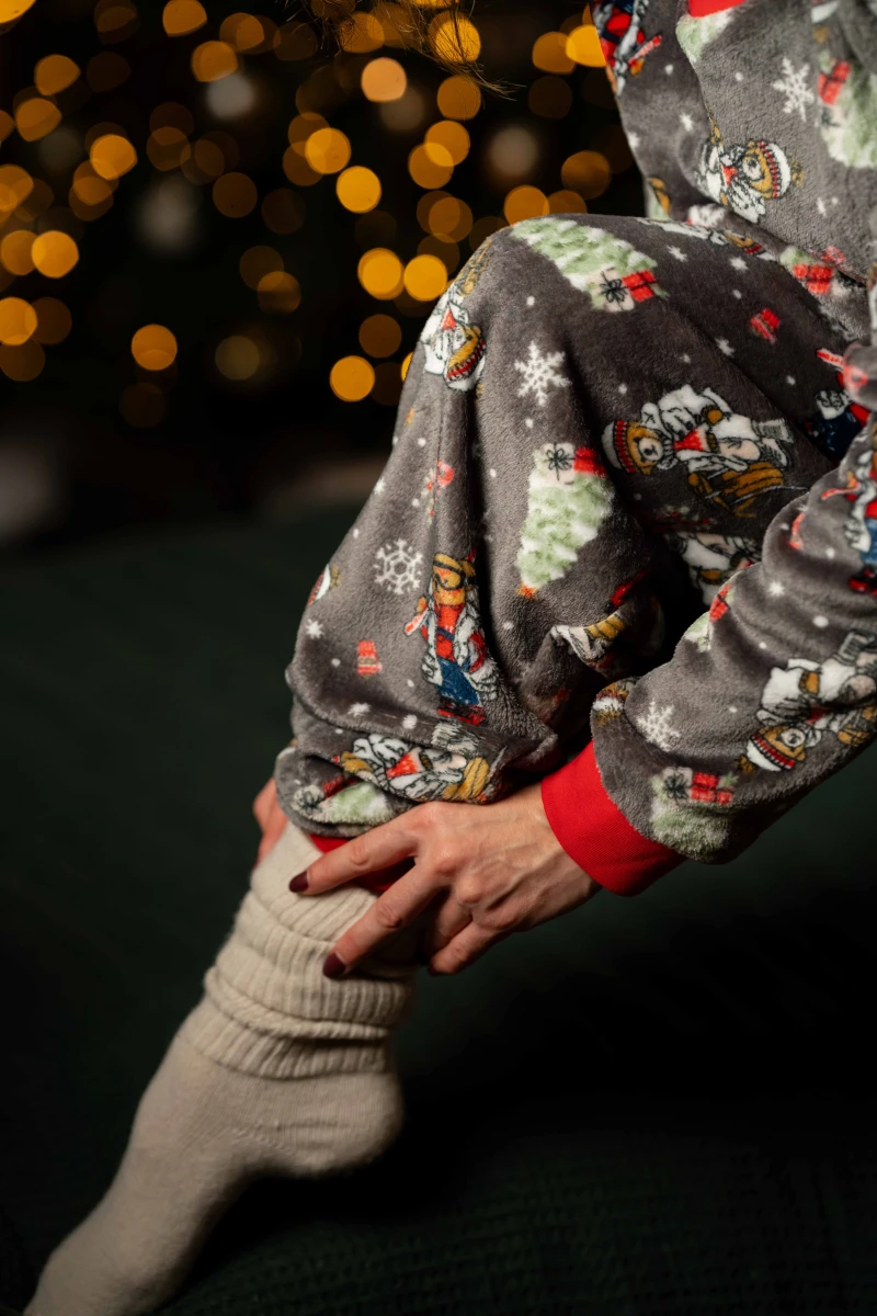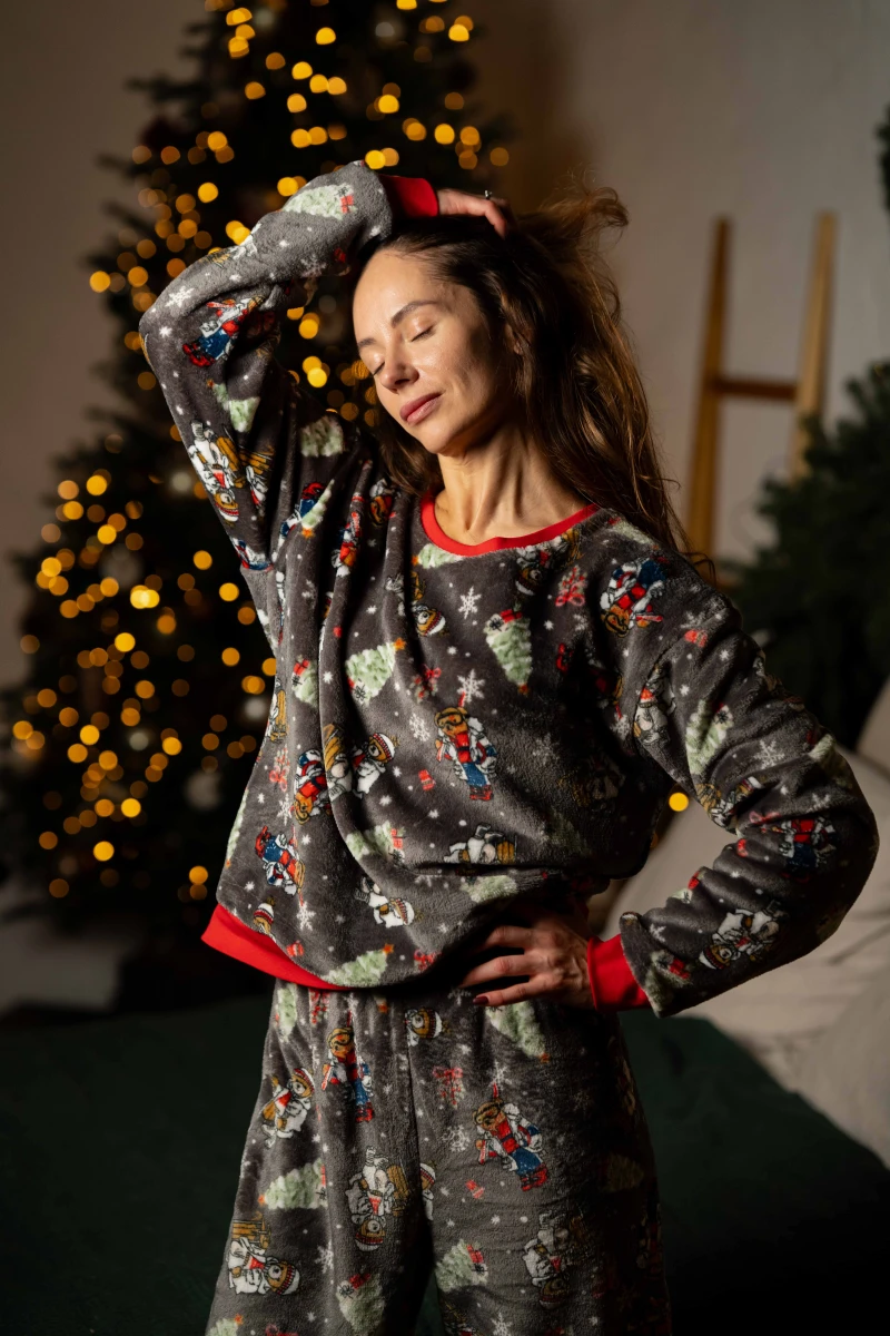 - Піжамний костюм з м'якого велсофту з новорічним принтом призначений для максимального комфорту та затишку. Комплект складається з світшота вільного крою та штанів на гумці з манжетами. Манжети на рукавах і штанах, а також комір світшота виконані в червоному кольорі, що надає святкового настрою. Теплий і приємний до тіла матеріал добре зберігає форму, не викликає подразнення та легко стирається. Сірий фон із зимовими малюнками сніговиків, ялинок та сніжинок створює атмосферу домашнього тепла та святкового комфорту – ідеальний вибір для зимових вечорів та новорічного відпочинку.