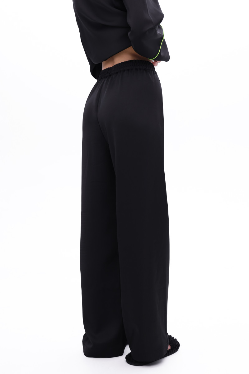 Жіночий домашній костюм, що поєднує витончений стиль та комфорт. Виконаний із щільної атласної тканини, яка чудово тримає форму та створює елегантний силует. Глибокий чорний колір доповнюється вишуканим салатовим кантом, надаючи образу акценту. Прямі штани та вільна сорочка з класичним коміром та застібкою на гудзики роблять цей костюм ідеальним вибором для домашнього відпочинку, прийому гостей або стильного проведення часу. -