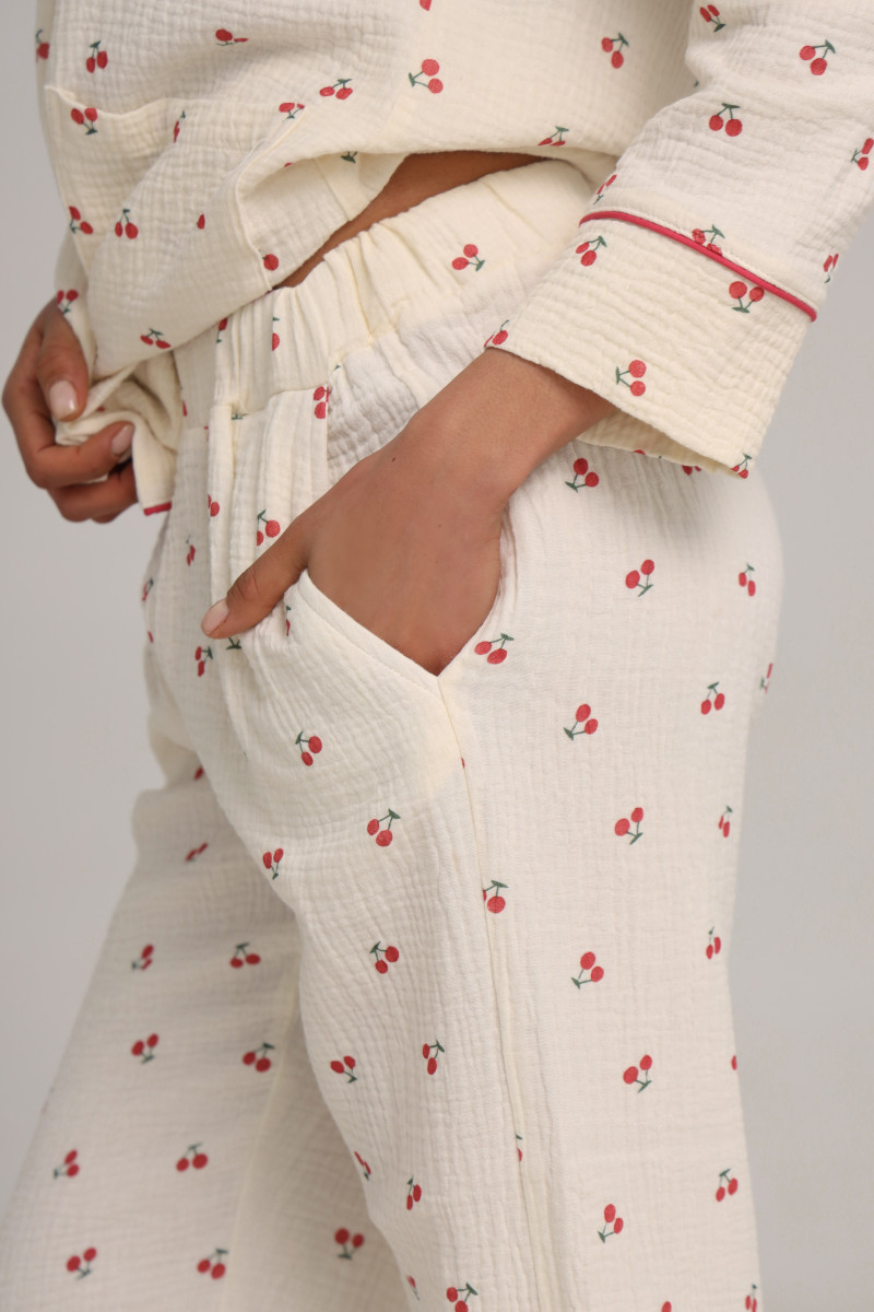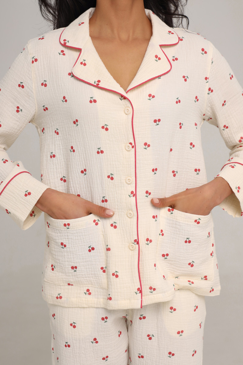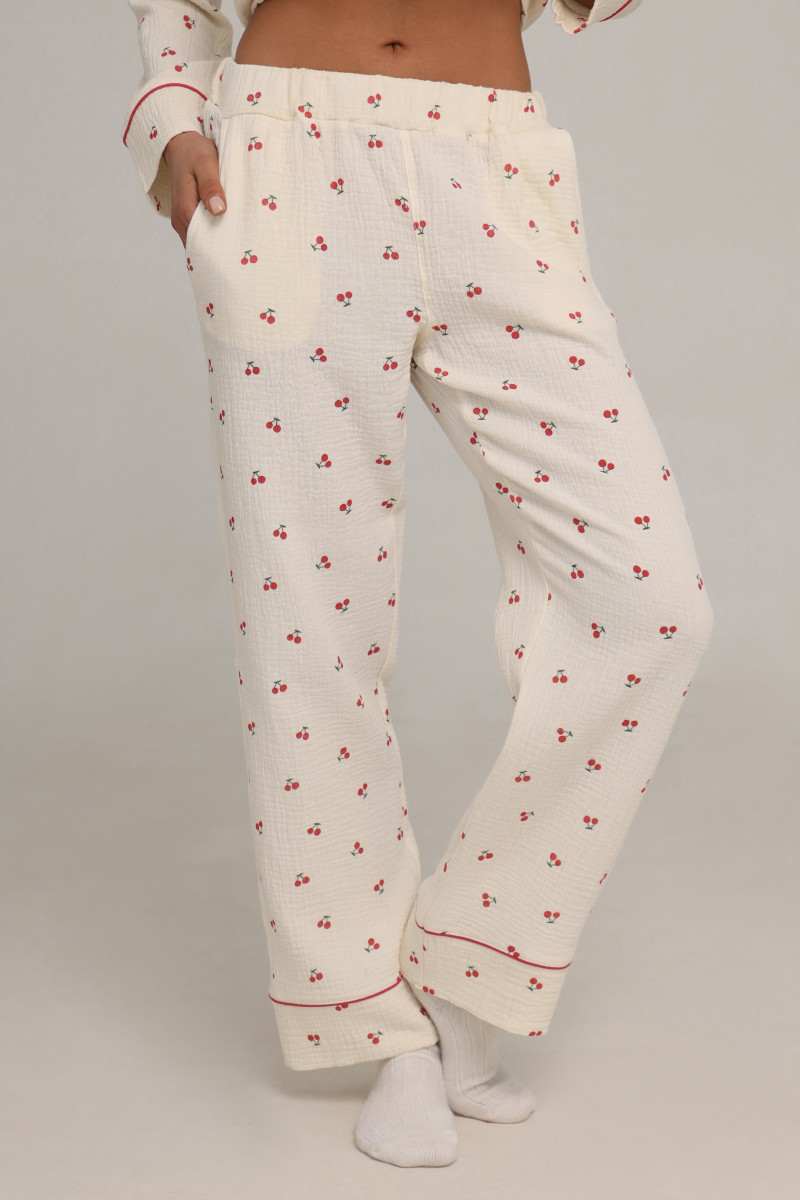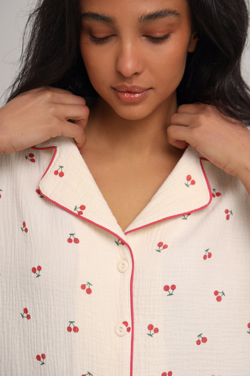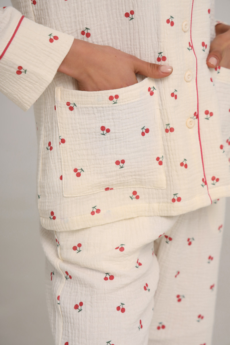 Цей піжамний костюм ідеально підходить для сну, відпочинку або вечірніх посиденьок. Приємний молочний колір з вишеньками та бордовими акцентами дарує затишок та робить образ елегантним. Муслін дозволяє шкірі дихати, що особливо важливо у спеку.