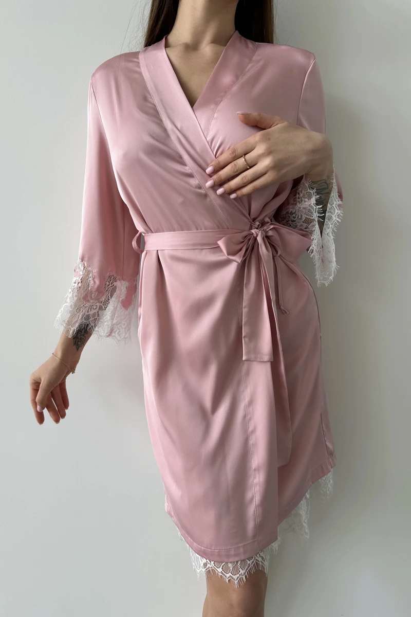 Вид тканини Шовк Склад тканини 50% шовк, 50% поліестер Колір Пудра Опис Втілення ніжності та грації: шовковий комплект із халата та сорочки в пудровому кольорі. Цей комплект — ...