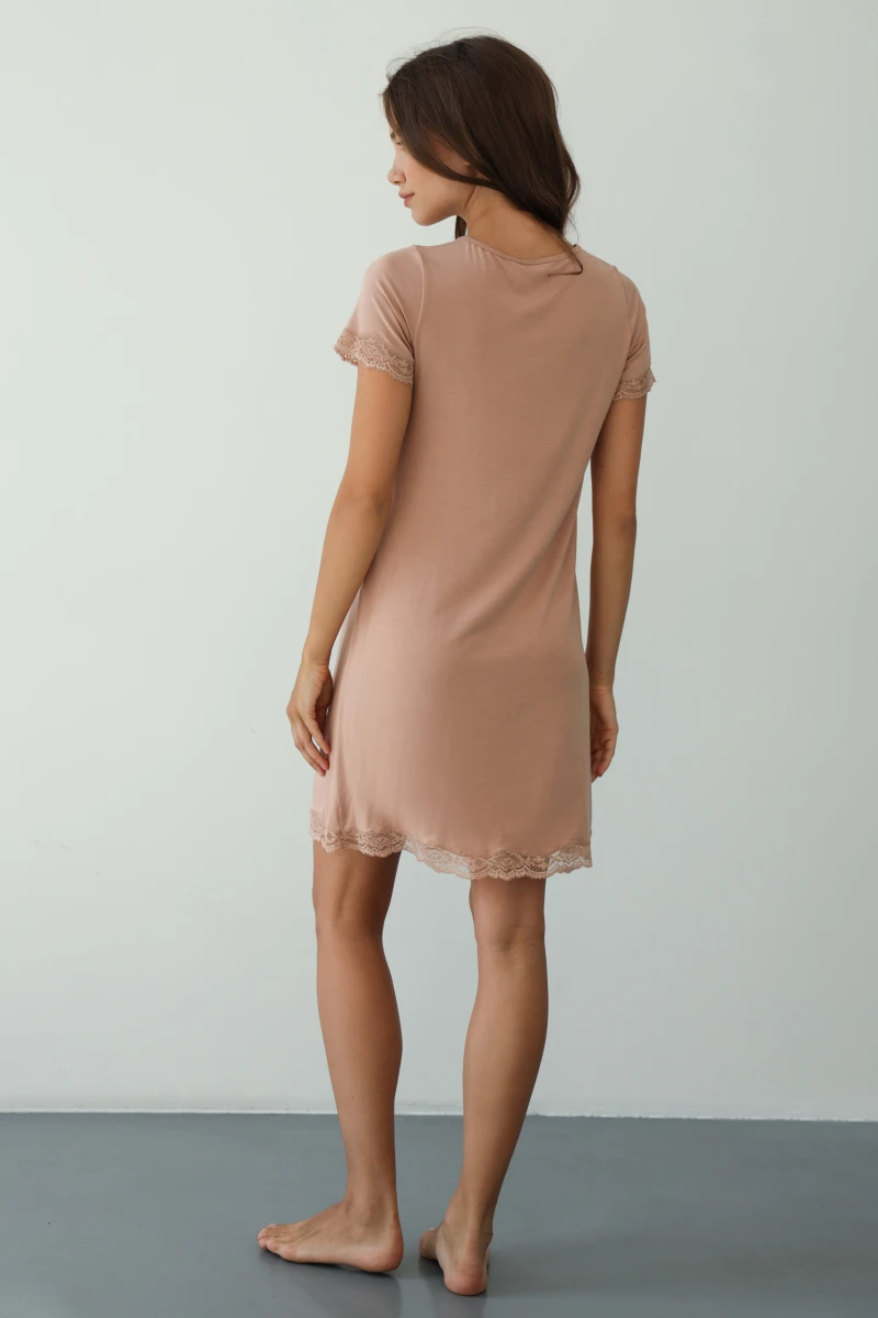 Тип тканини Трикотаж модал Склад тканини 95% модал, 5% еластан Колір Бежевий Опис Футболка-сорочка для сну з модала з мереживом у бежевому кольорі - це ідеальне поєднання вишук...
