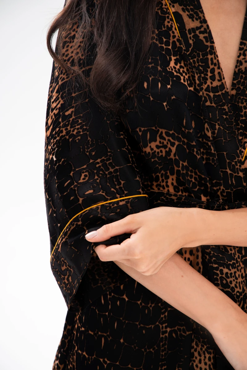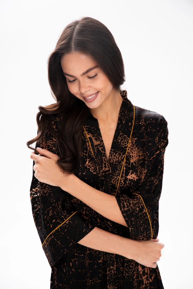Жіночий халат із витонченим кантом призначений для комфортного відпочинку та легкого настрою. Напівпрозора тканина надає образу ніжності, а легкий ненав'язливий леопардовий принт надає сучасного шарму. Вільний крій і пояс забезпечують зручність у носінні і підкреслюють жіночність, а широкі рукави створюють почуття легкості та свободи рухів. Це стильне поєднання практичності та елегантності стане ідеальним вибором як для дому, так і для відпочинку.