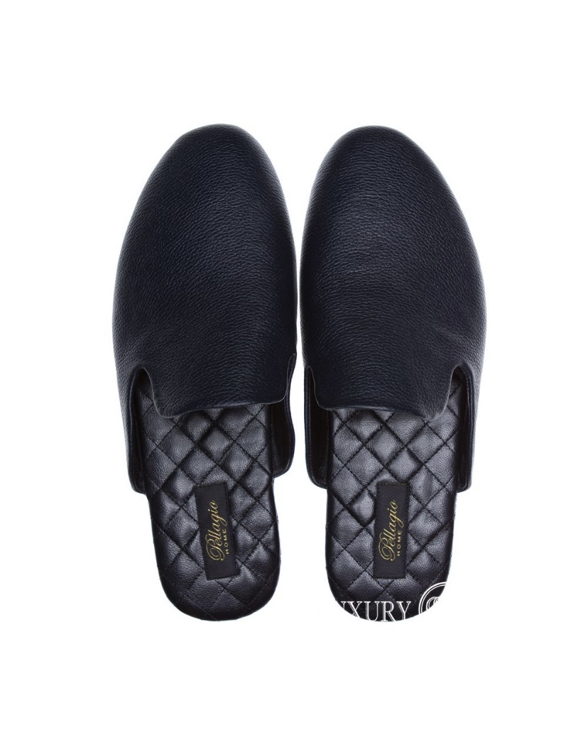 Темно-сині капці з елегантною істильною простроченою устілкою майже не відчуваються на нозі.Для іх пошиття використовували м'який та еластичний від природи матеріал,що дзволяє зберегти форму виробу навіть при частих деформаціях.Для анатомічно правильноі форми створили фігурну союзку,тому модель повторює всі рухи стопи.Рекомендовано купляти розмір в розмір. -