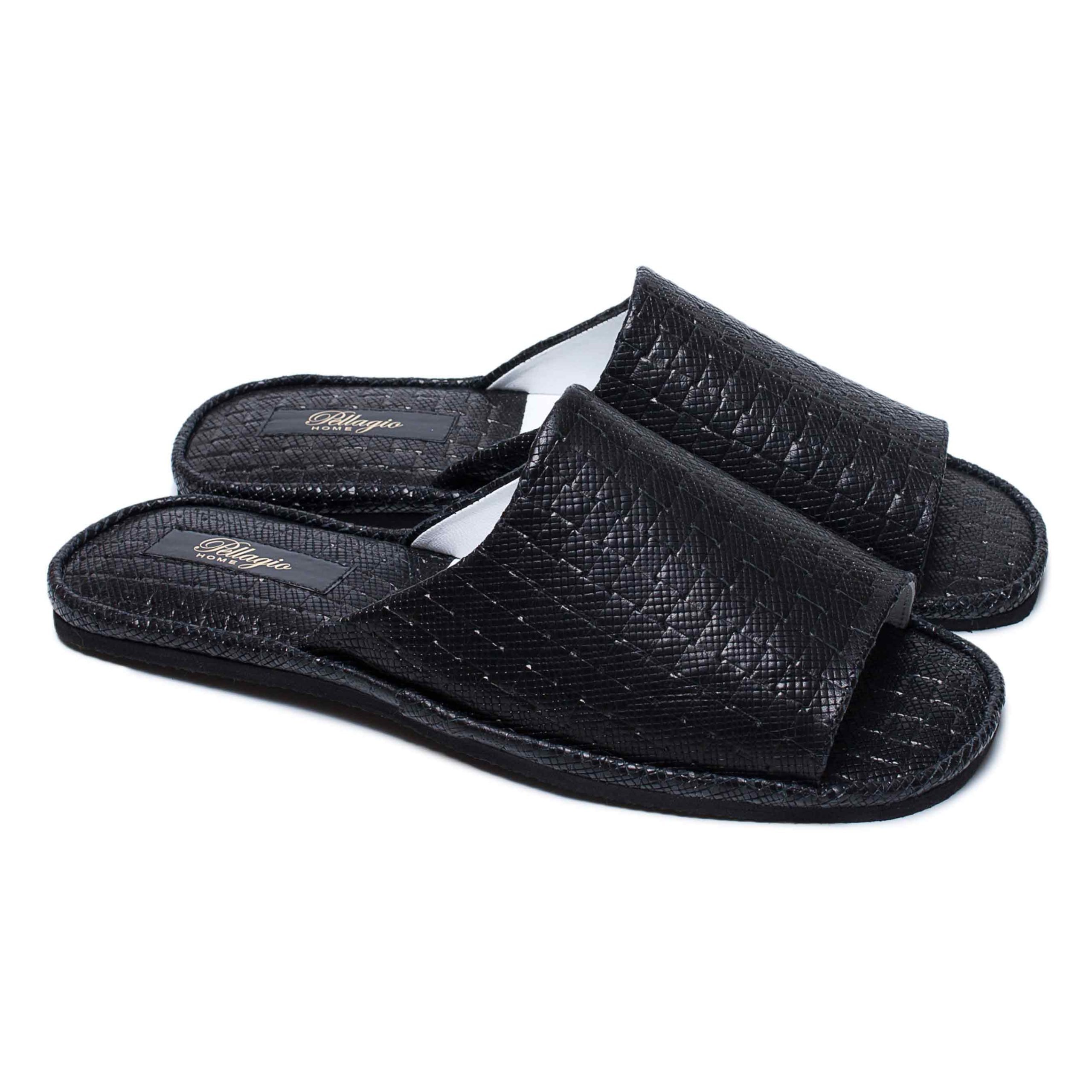 Класична модель відкритих чоловічих капців чорного кольору з відомим принтом. Легка і безшумна підошва з EVA дозволить вийти в капцях навіть на відкриту терасу.