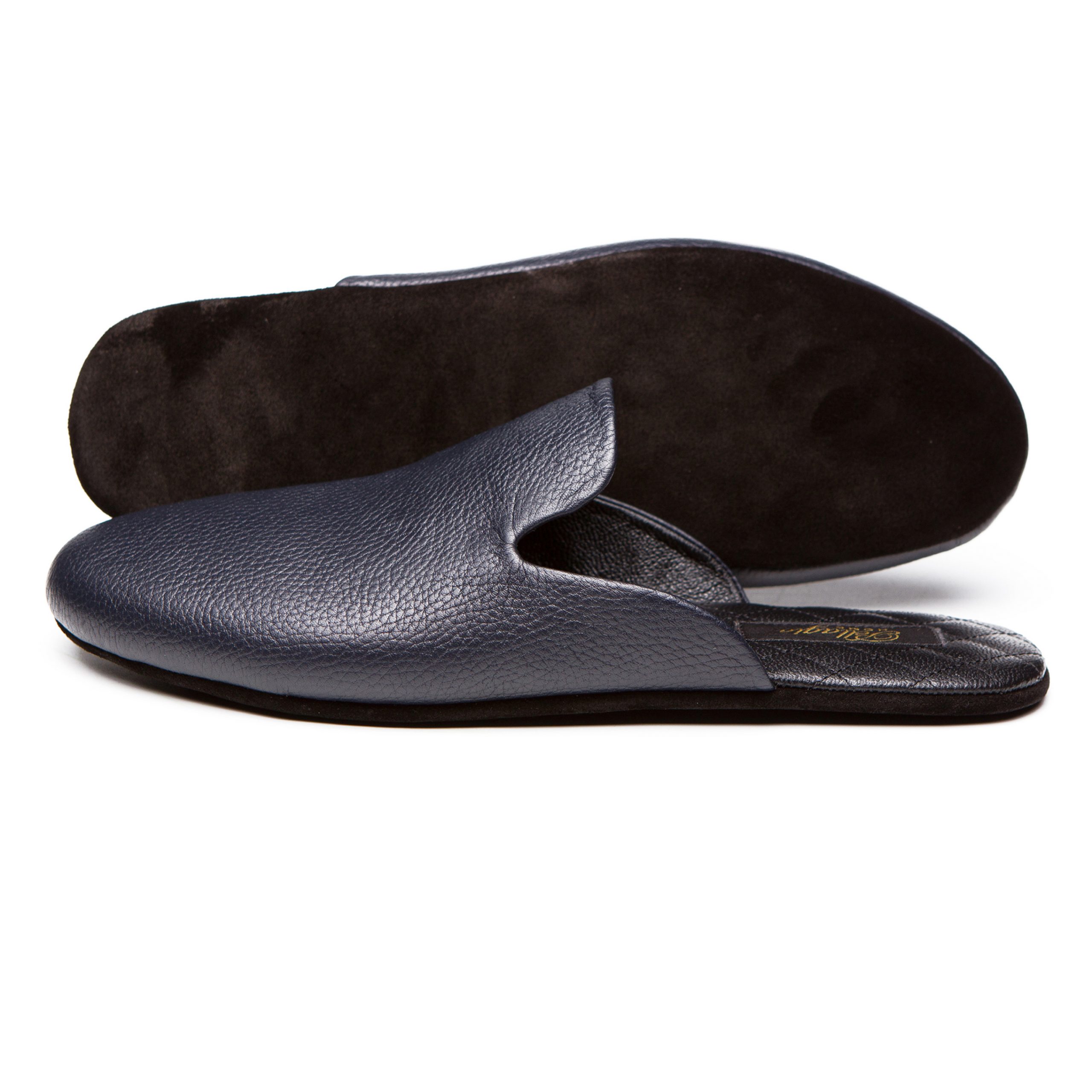 Темно- сині капці з елегантною і стильною простроченою устілкою майже не відчуваються на нозі. Для їх пошиття використовували м’ягкий та еластичний від природи матеріал, що дозволяє зберегти форму виробу навіть при частих деформаціях. Для анатомічно правильної форми створили фігурну союзку, тому модель повторює всі рухи стопи