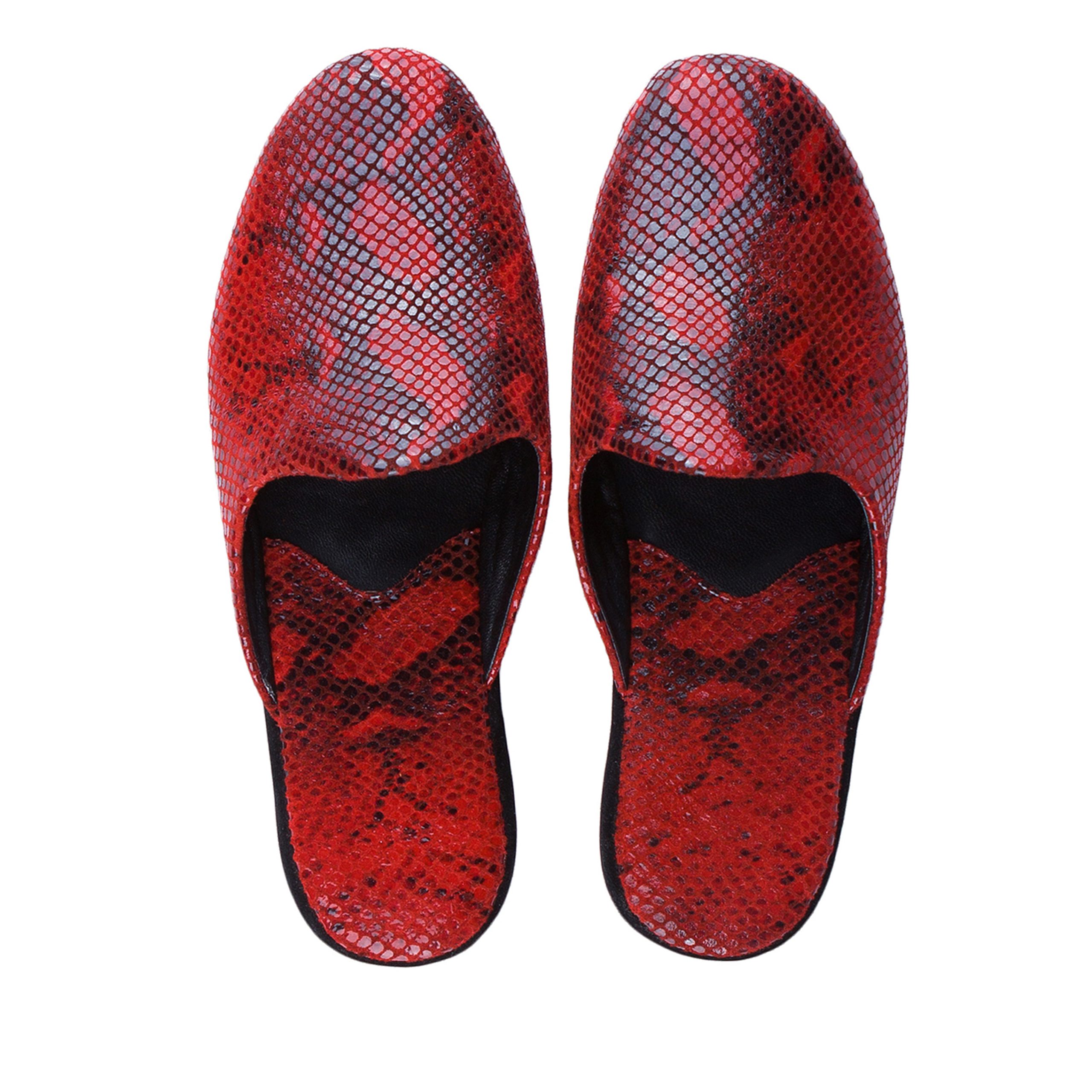 Домашні капці з закритим носком виконані зі шкіри з фактурою червоної змії. Анатомічна форма допомагає стопі залишатися в природньому положенні, а гнучка підошва з міцної замші не ковзає на гладких поверхнях і забезпечує ногам комфорт, що не обтяжуює взуття.