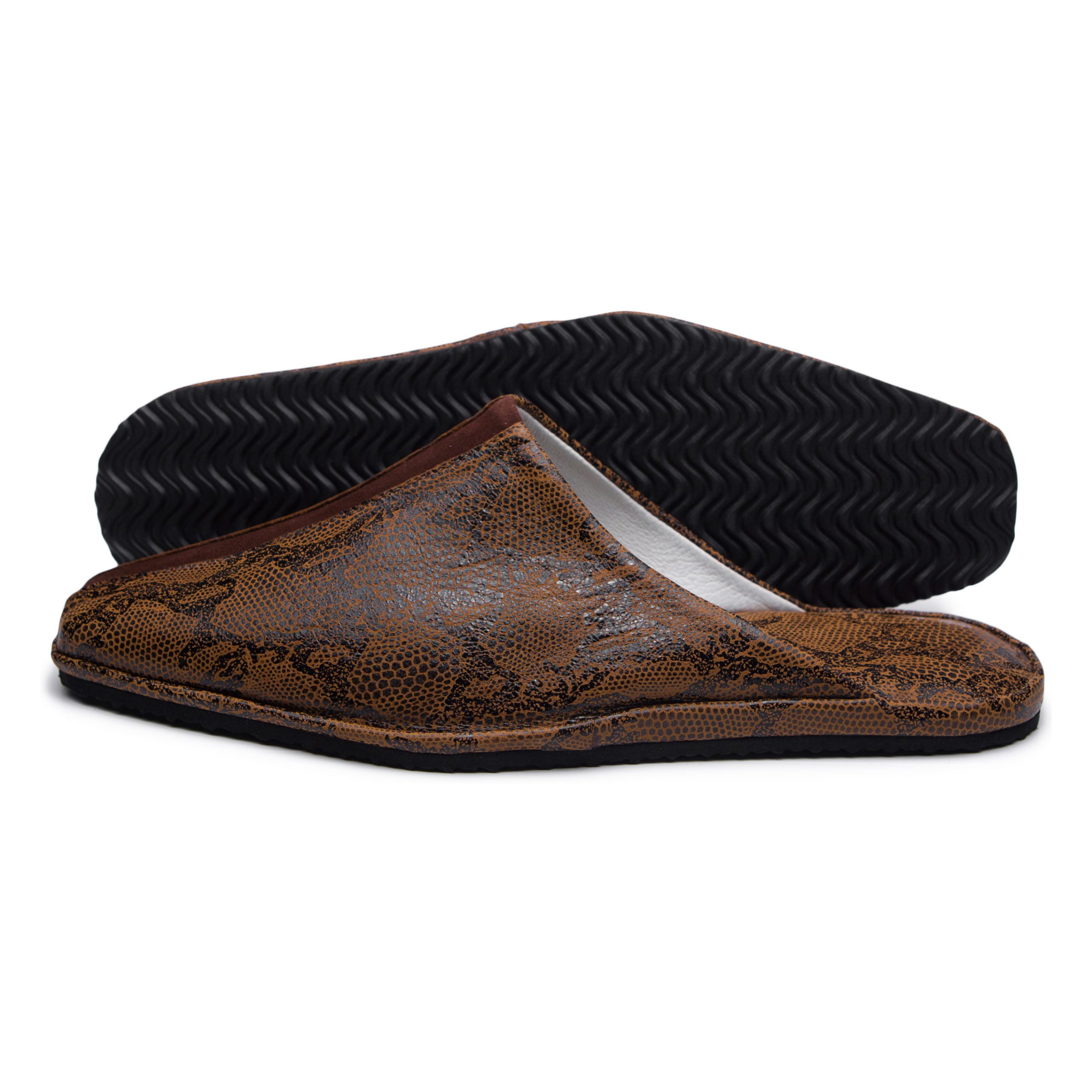 Закриті елегантні чоловічі капці коричневого кольору, виготовлені з міцної та еластичної шкіри з імітацією шкіри змії, легка і безшумна підошва з EVA робить їх дуже практичними. УВАГА! На вузьку стопу можна брати на розмір менше. На широку – розмір у розмір.
