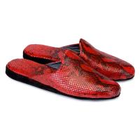 Домашні капці з закритим носком виконані зі шкіри з фактурою червоної змії. Анатомічна форма допомагає стопі залишатися в природньому положенні, а гнучка підошва з міцної замші не ковзає на гладких по...