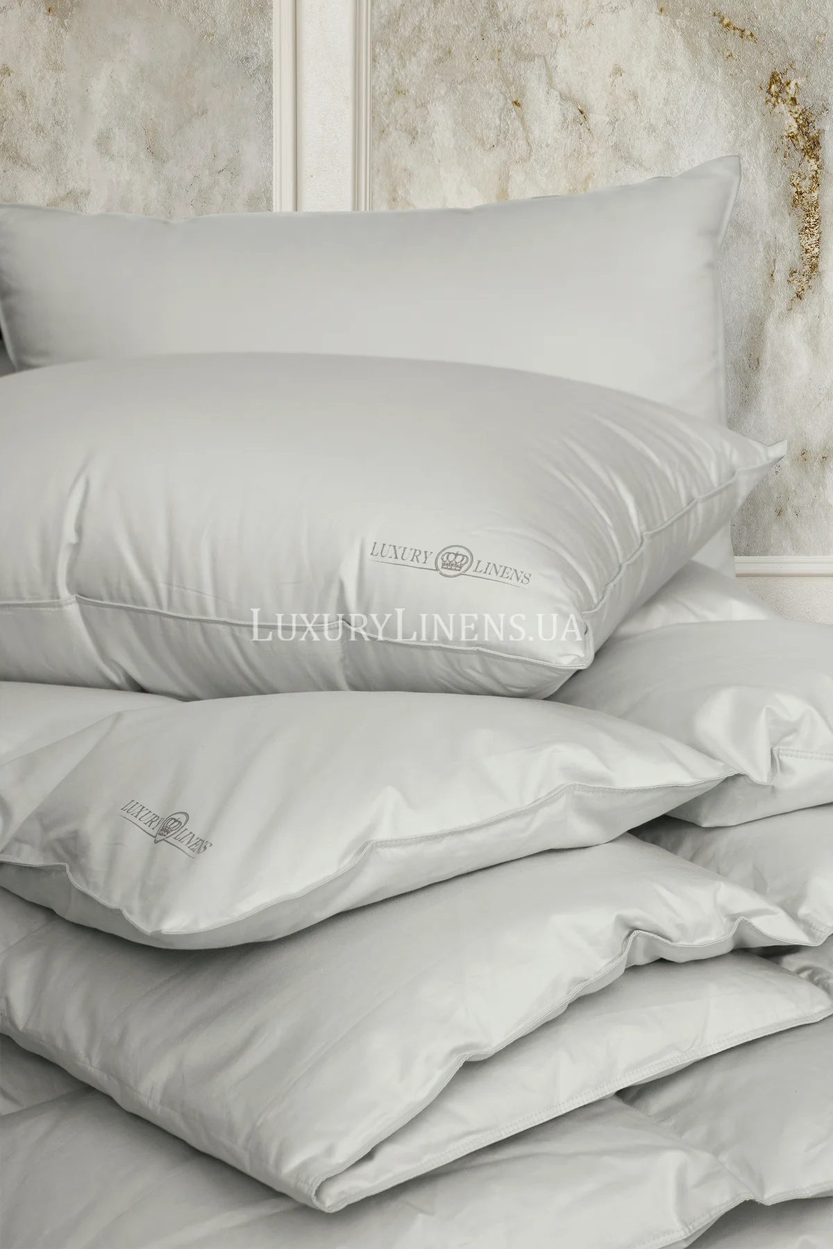 Чохол: сатин преміум (100% бавовна) Наповнювач: Новый, чистый, серебристый гусиный пух - 100% пух, DIN EN 12934. Fill Power 750, обработка Super Clean, гипоаллергенный Дизайн: світло-сірий чохол з...