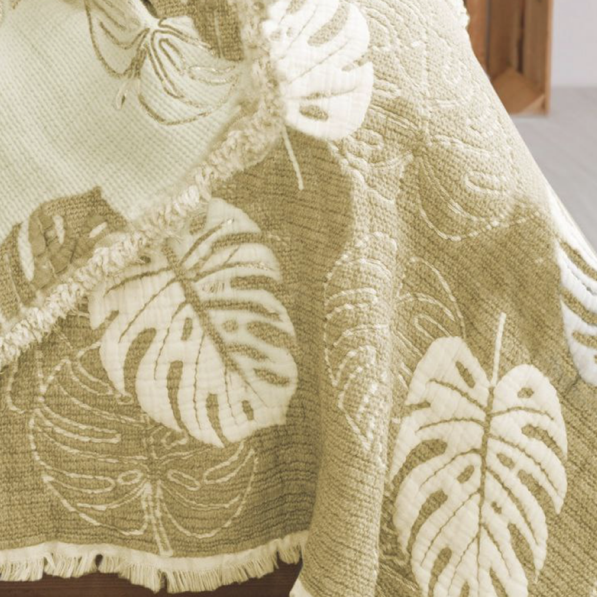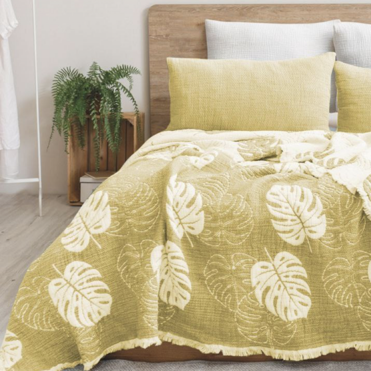 Пориньте у світ затишку та сучасного дизайну з комплектом Forest від відомого турецького бренду Saheser. Це не просто покривало з наволочками - це вишуканий текстиль, що наповнює вашу спальню гармонією природи та стильним комфортом.Forest має унікальний двосторонній дизайн: на одній стороні світле листя на темнішому тлі, а на іншому – навпаки. Така комбінація дозволяє змінювати вигляд вашого інтер'єру за настроєм, створюючи атмосферу свіжості, спокою та природної елегантності. Доповнює цю картину розкішна бахрома по краях покривала, що надає комплект особливого шарму.