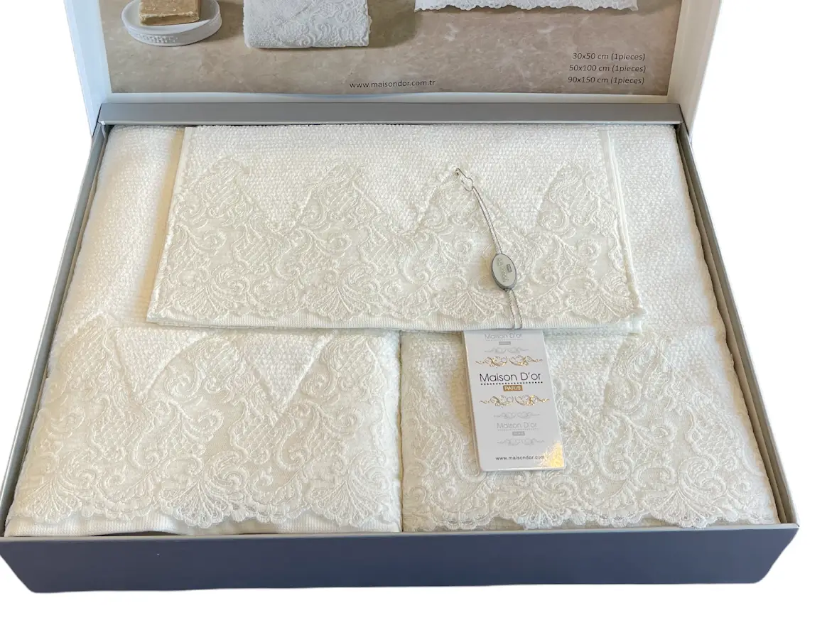 Бренд MAISON DOR Тканина 100% бавовна Країна виробник Туреччина Країна реестрації бренду Туреччина Колір молочний Кількість у наборі, шт 3 Пол Жіночі Комплектация Набор Склад Махра Матеріал Махрові Розмір 90х150, 30х50, 50х100 -