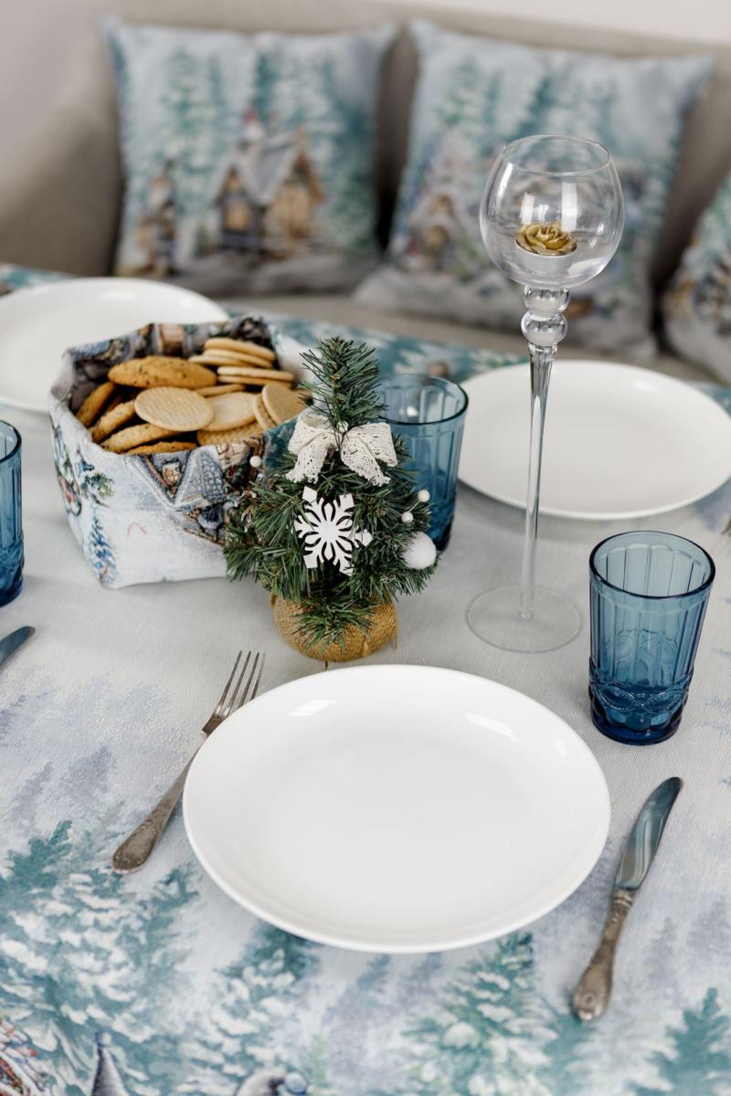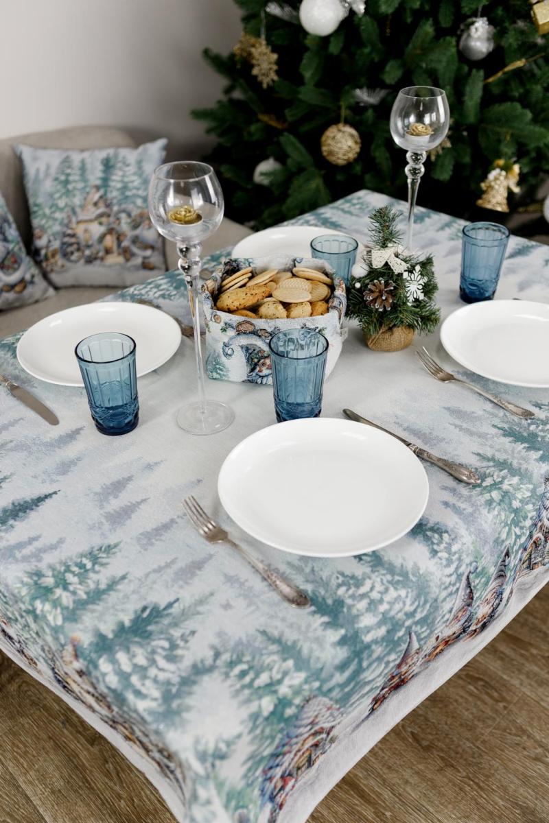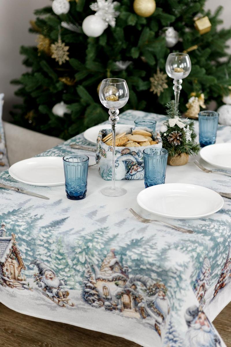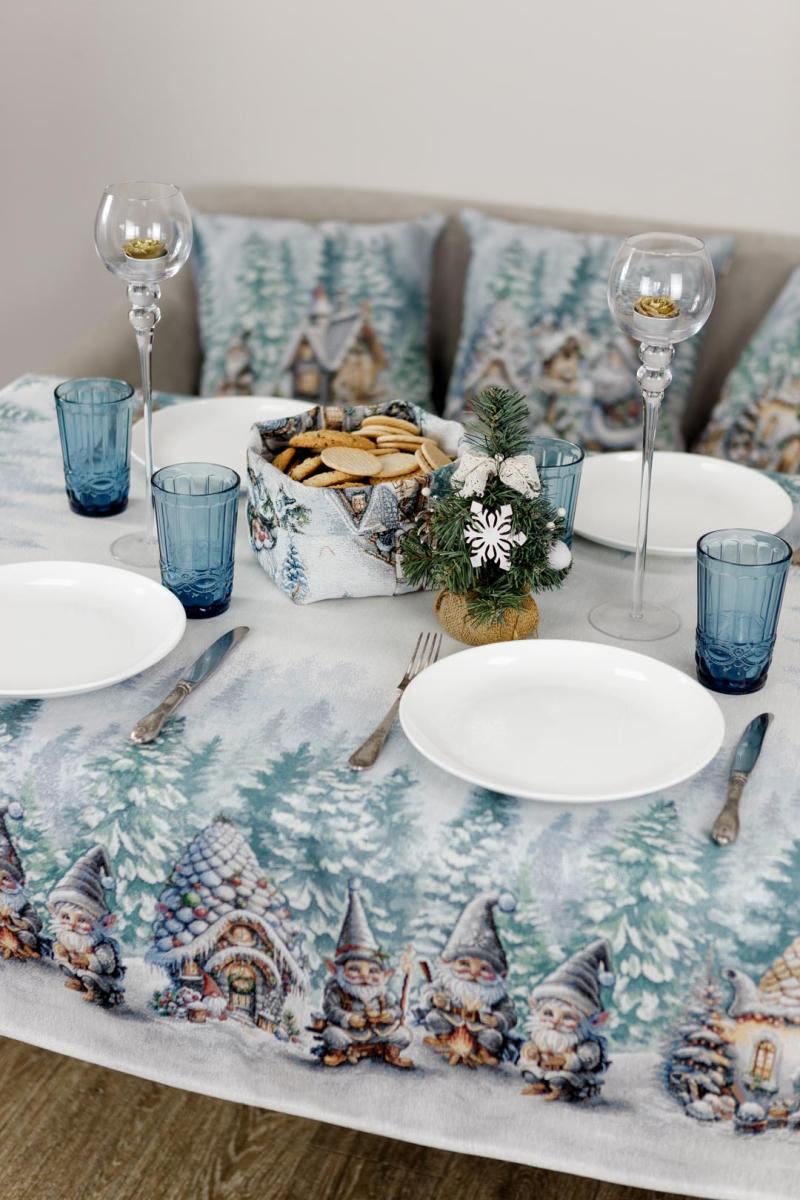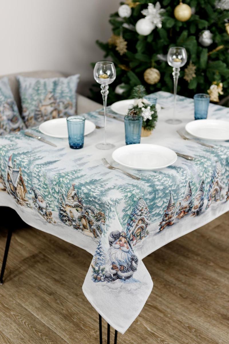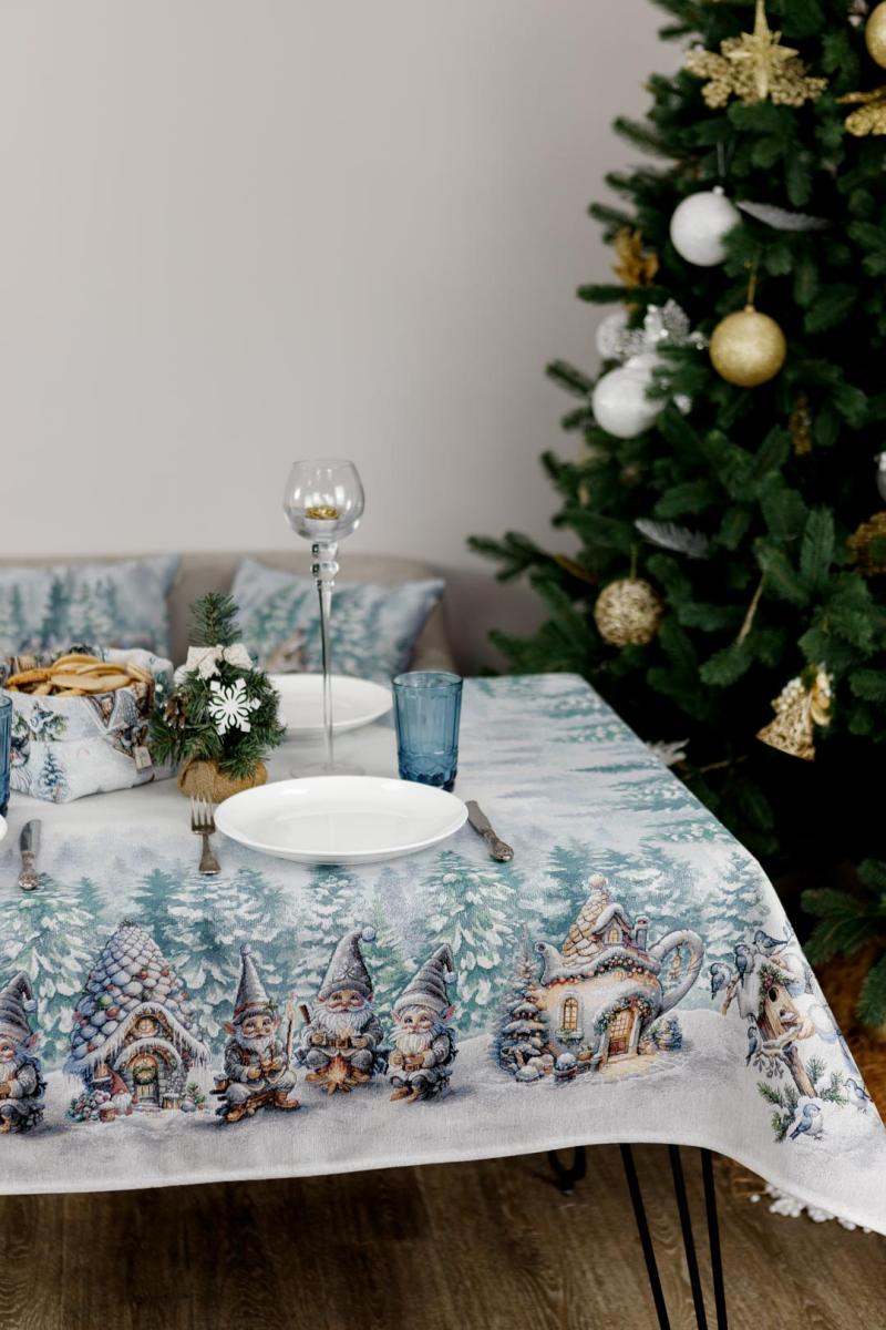 Купити новорічну гобеленову скатертину на стіл Казкові гноми Скатертина прикрасить вітальню або кухню. Це стильний подарунок сім'ї, друзям, родичам та колегам на честь чарівного свята. -